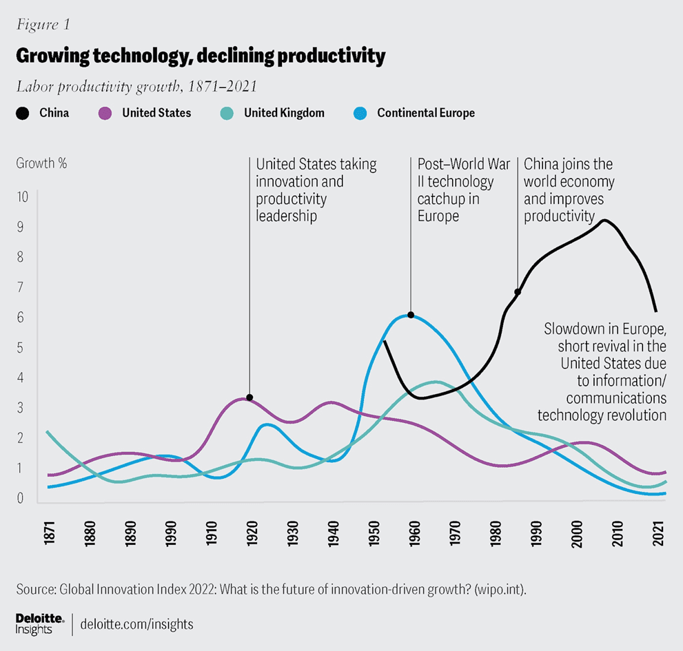 Labor productivity growth 1871-2021 für China, USA, UK und Continental Europe – historische Produktivitätsentwicklung und recent slowdowns