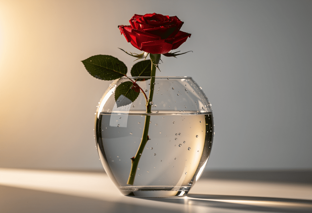 PROMPT — Product Photography Visualization] a hyperrealistic product shot of a glass vase filled with water, single red rose, morning golden light from the left side, dewdrops on surface with accurate surface tension, correct light refraction through water and glass, professional studio photography, Fresnel reflections, physically accurate materials, shot on medium format camera, Hasselblad H6D, extremely high detail