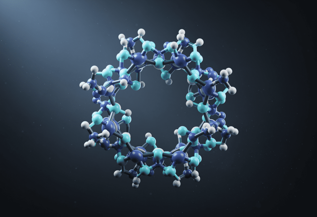 PROMPT — Scientific Visualization Scene a photorealistic molecular structure visualization of a cyclic polymer chain with aromatic substituents, rendered in blue and cyan colors, atomic level detail visible, scientifically accurate bond angles and distances, floating in abstract space with subtle volumetric lighting, professional scientific illustration style, rendered in Octane, ultra high detail, suitable for academic publication